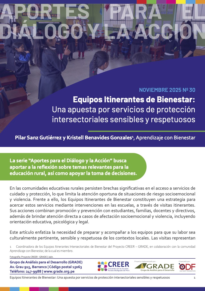En esta nueva entrega de la serie Aportes para el Diálogo y la Acción, se presenta la experiencia de los Equipos Itinerantes Intersectoriales de Bienestar, una estrategia del Proyecto CREER que acerca los servicios de cuidado y protección a las escuelas rurales multigrado de Cajamarca.